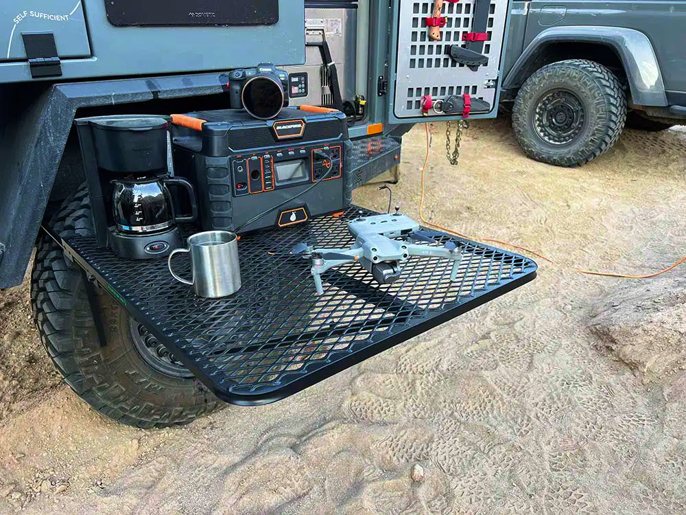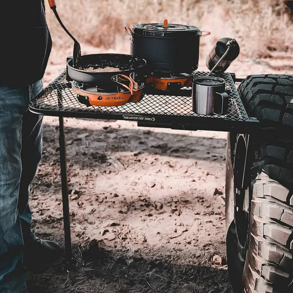 A overlanding camping table that uses your vehicle or trailer tire as its main support, making it a stable and level work surface regardless of the ground conditions. When every inch of space in your rig matters, the Original Tailgater Tire Table is a must have. It folds up flat with all pieces secured on the table, so you can tuck it away without wasting valuable space.